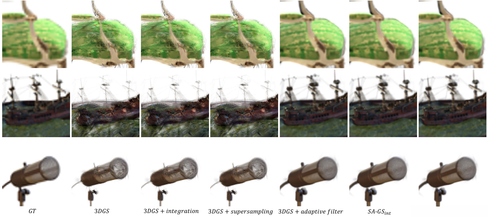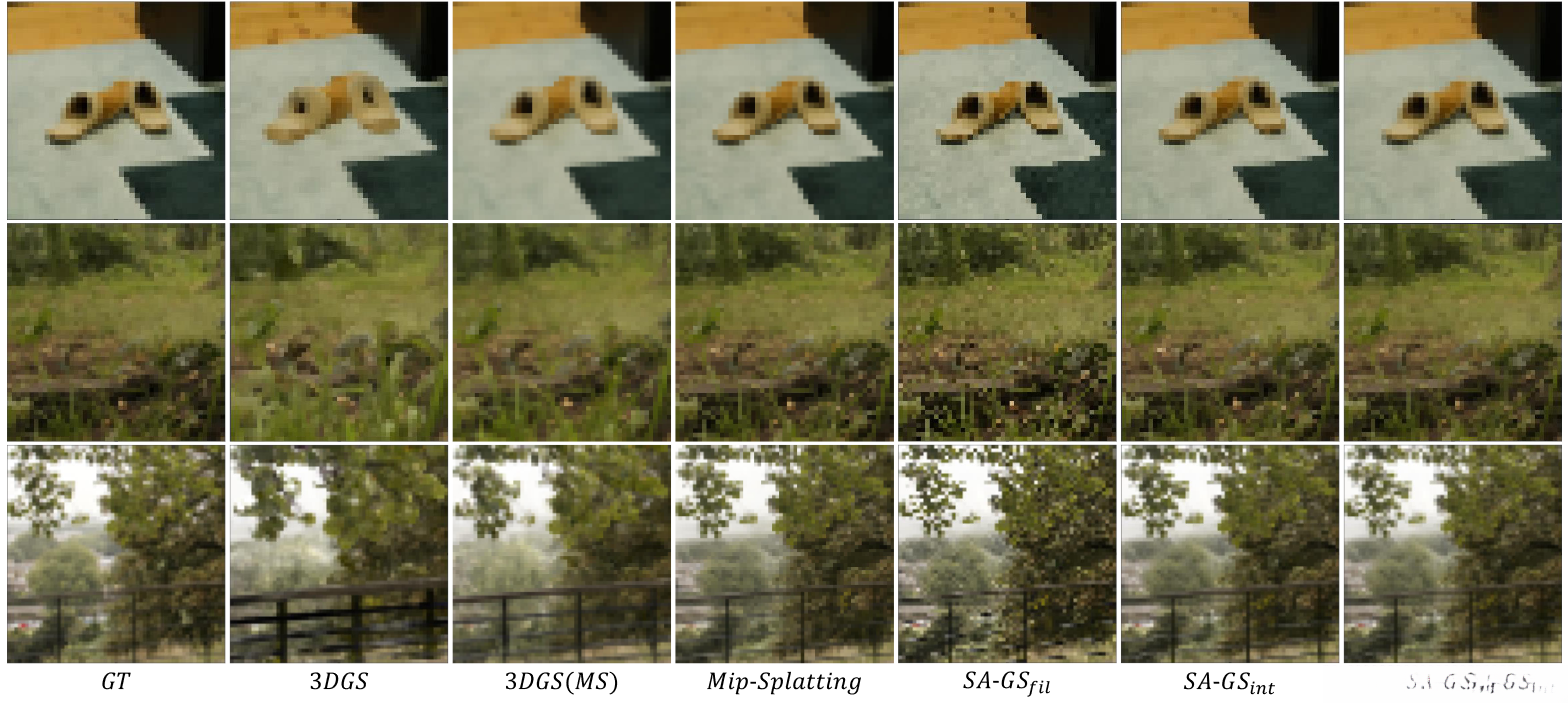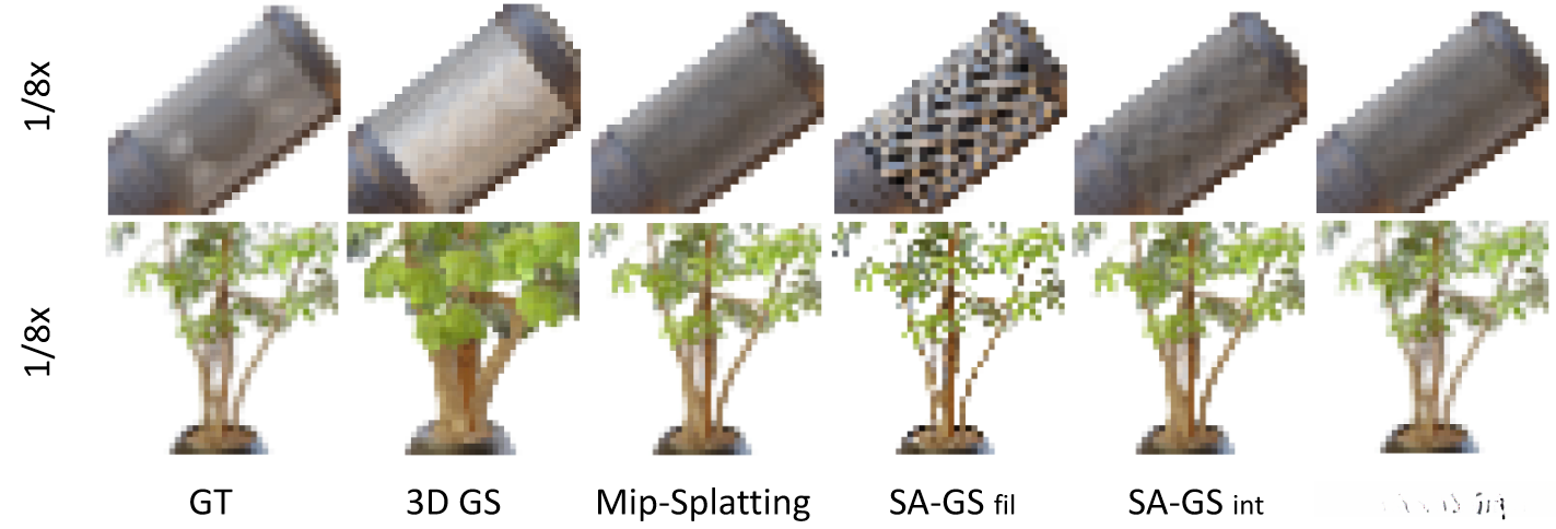 In addition, we utilize conventional anti-aliasing techniques such as spatial super-resolution sampling and integration to effectively mitigate image aliasing at reduced sampling rates. Furthermore, SA-GS exhibits either superior or comparable performance relative to the state-of-the-art technology, which is substantiated by extensive validation across both bounded and unbounded scenarios.