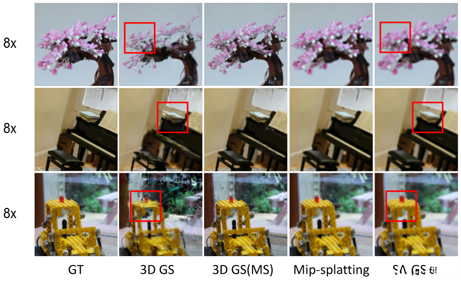该二维可缩放滤镜在各种渲染设置中均能保持高斯分布的一致性。此外,我们的积分与超采样方法进一步提升了高斯场景中的抗混响能力。值得注意的是,这些积分与超采样方法仅在配合二维可缩放滤镜使用时才能发挥最佳效果。