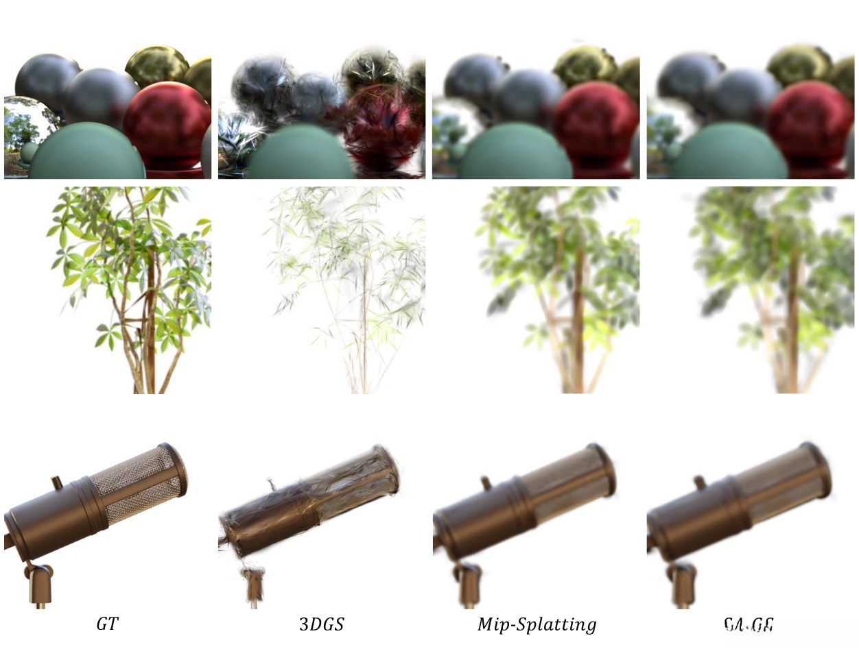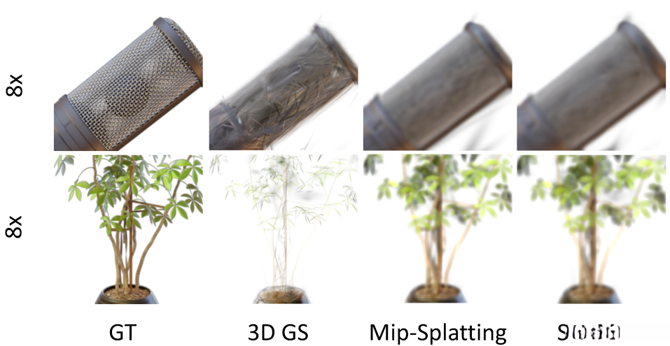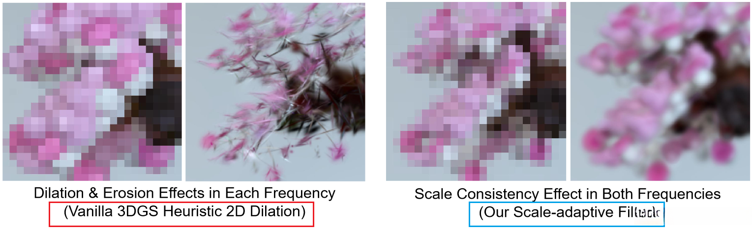 It was noted by Mip-Splatting that detecting Gaussians at different frequencies causes mismatches between the Gaussian scales during training and testing. Mip-Splatting addresses this problem through 3D smoothing and 2D Mip filters, which unfortunately are not ignorant of the test frequency.