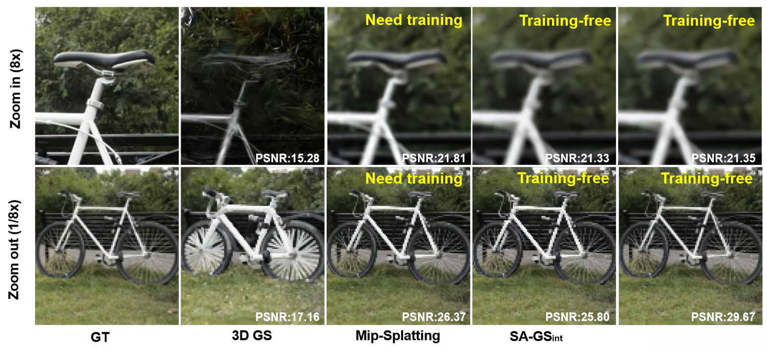 Our 2D scale-adaptive filter keeps the Gaussian consistent across various rendering configurations. The performance of {SA-GS}_{int} is on par with that of Mip-Splatting techniques, whereas {SA-GS}_{sup} surpasses them, ensuring optimal efficiency in this context.