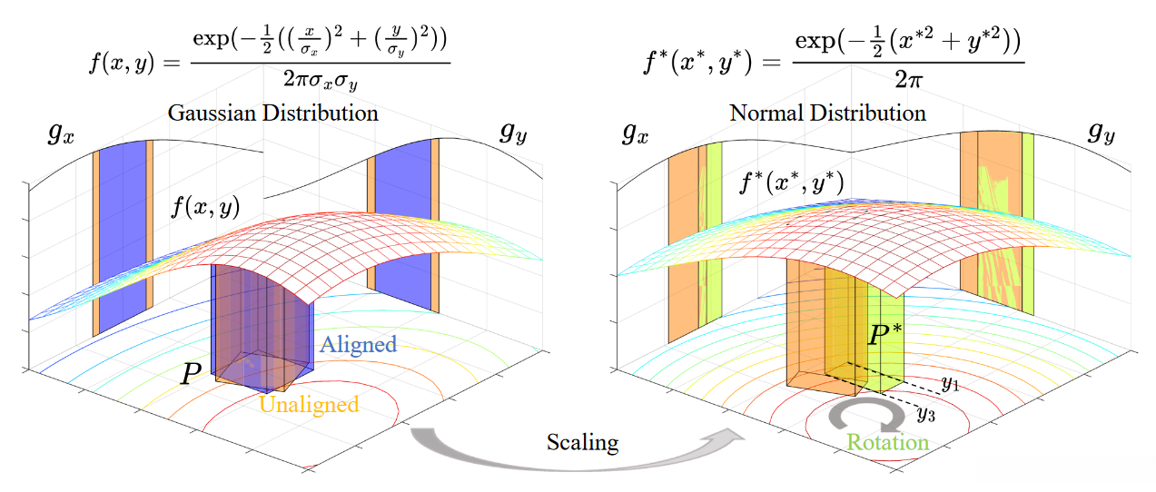 (b) The integration method factorizes the Gaussian covariance matrix through pixel-wise rotation. The corresponding integration process factors into a product of two marginal Gaussian distributions.