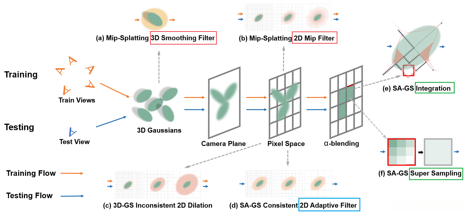 该方法无需训练且仅在测试流程中执行操作。该方法通过在像素空间中采用**(d)**来保持高斯原素的比例一致,并进一步通过__(e)和(f)__优化__α__融合过程来提升3DGS的抗锯齿能力。