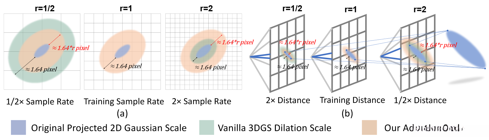 An empirical method for performing 2D expansion within vanilla 3DGS code processes pixels and increases the size of the projected 2D Gaussian distribution by a predetermined increment, typically around 1.64 pixels. However, using a fixed 2D expansion factor of approximately 1.64 pixels can lead to scale ambiguities when depicting identical scenes under varying rendering configurations, as indicated by the highlighted green area.