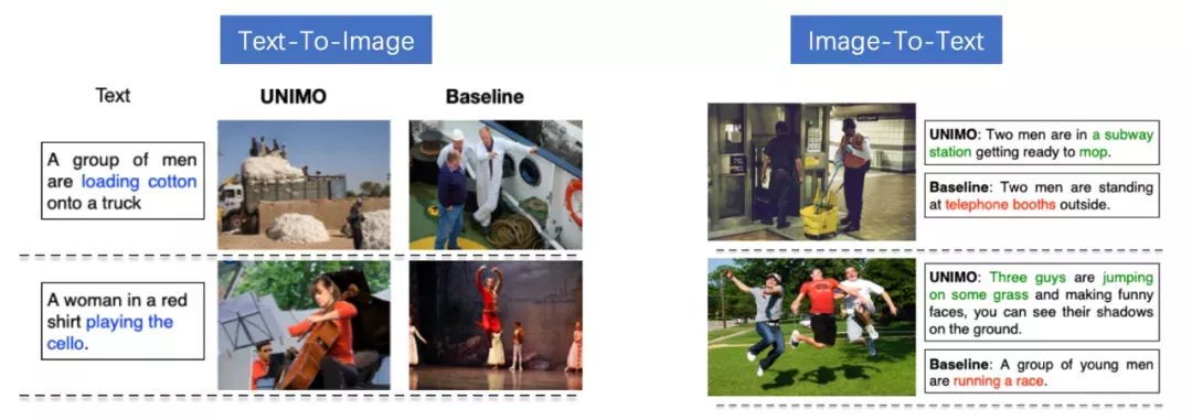 UNIMO 支持根据文字描述查找相关图片,并根据图片查找相关的文本描述。从结果来看,在处理文字与图片的语义理解方面表现更为出色。
