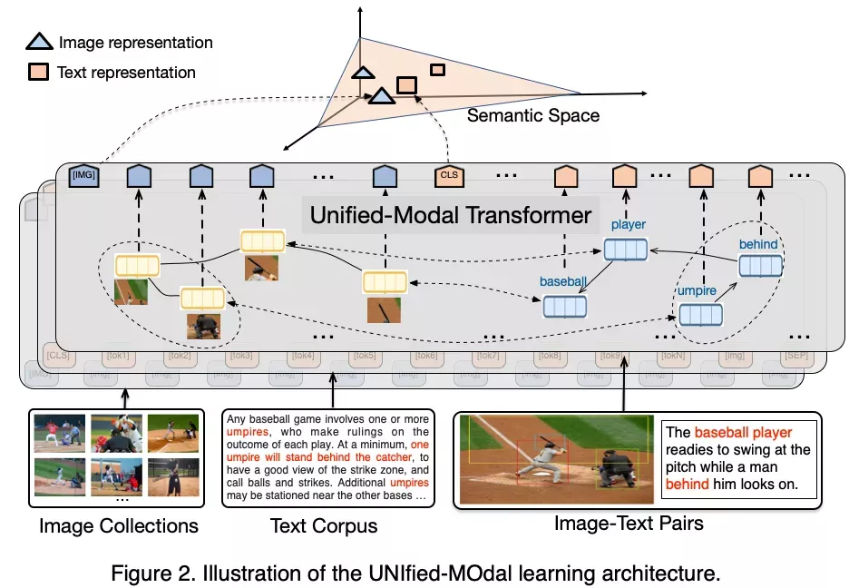 基于异构模态数据进行统一预训练的方法命名为UNIMO,在数据预处理阶段采用文本、图像以及图文组合的方式进行特征提取,在模型架构设计中采用了Transformer网络作为核心组件,在具体的训练环节中将三种不同的模态数据经过特征提取后被整合到统一的空间中进行处理。这种方法不仅实现了对单一模态数据的有效捕捉能力而且能够高效地处理跨模态任务;其中图像信息被转化为目标(object)序列 文本信息则被转换为词(token)序列 而图文对则被编码为目标序列与词序列的拼接形式;在模型的学习过程中 三种类型的数据均被纳入同一个编码空间 运用掩码预测的方式进行自监督学习 并且通过图文对的数据展开跨模态对比学习 这种联合的学习机制使得模型能够在文本知识与视觉知识之间实现互相促进 从而显著提升了文本语义表达能力以及视觉语义表达能力