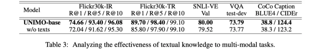 为了探究UNIMO在单一模式与多模式统一学习中必要性的作用,论文开展了一系列系统性实验分析。实证分析表明,未采用纯文本预训练方案时,UNIMO模型在跨模态任务上的性能表现出现明显下降;而当舍弃图文配对与视觉特征独立训练方案时,同样导致其在纯文本条件下下的任务性能显著降低;这一发现充分揭示了UNIMO统一学习框架能够实现信息间的互补融合,并能通过促进两种信息处理维度间的协同进化关系形成,有效提升模型的整体处理能力