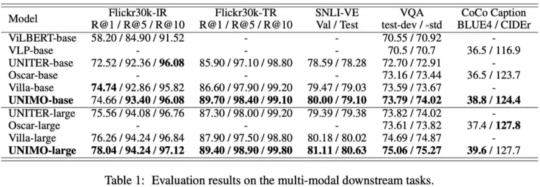 在跨模态任务研究中,我们对ViLBERT、UNITER、Oscar、Villa等最新预训练模型进行了系统性分析与全面评估。通过实证研究发现,在多个关键指标上(包括图文检索Flick率、视觉推断准确率SNLI-VE、视觉问答VQA性能以及图描述生成CoCo Caption生成质量),UNIMO模型均超越了现有所有预训练模型。这一成果充分验证了统一预训练UNIMO模型在处理多种跨模态任务方面的卓越性能。