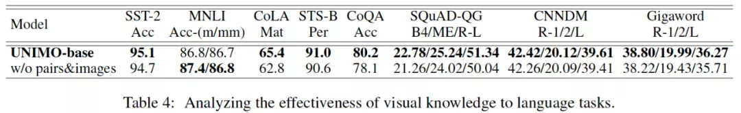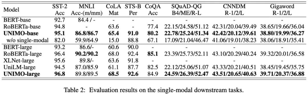 特别值得注意的是,UNIMO 不仅还能够处理纯文本任务。先前的跨模态预训练模型在其执行纯文本任务的过程中就已展现出明显的下降趋势,在某些情况下甚至出现了10-20个点以上的表现偏差。相比之下,在多种多样的文本理解和生成领域——包括但不限于文本分类、推理分析、摘要提炼以及阅读理解等多个方面——UNIMO 均展现出了显著的优势,并且其性能明显超越了 RoBERTa、XLNet 和 UniLM 等经典的单模态语言模型