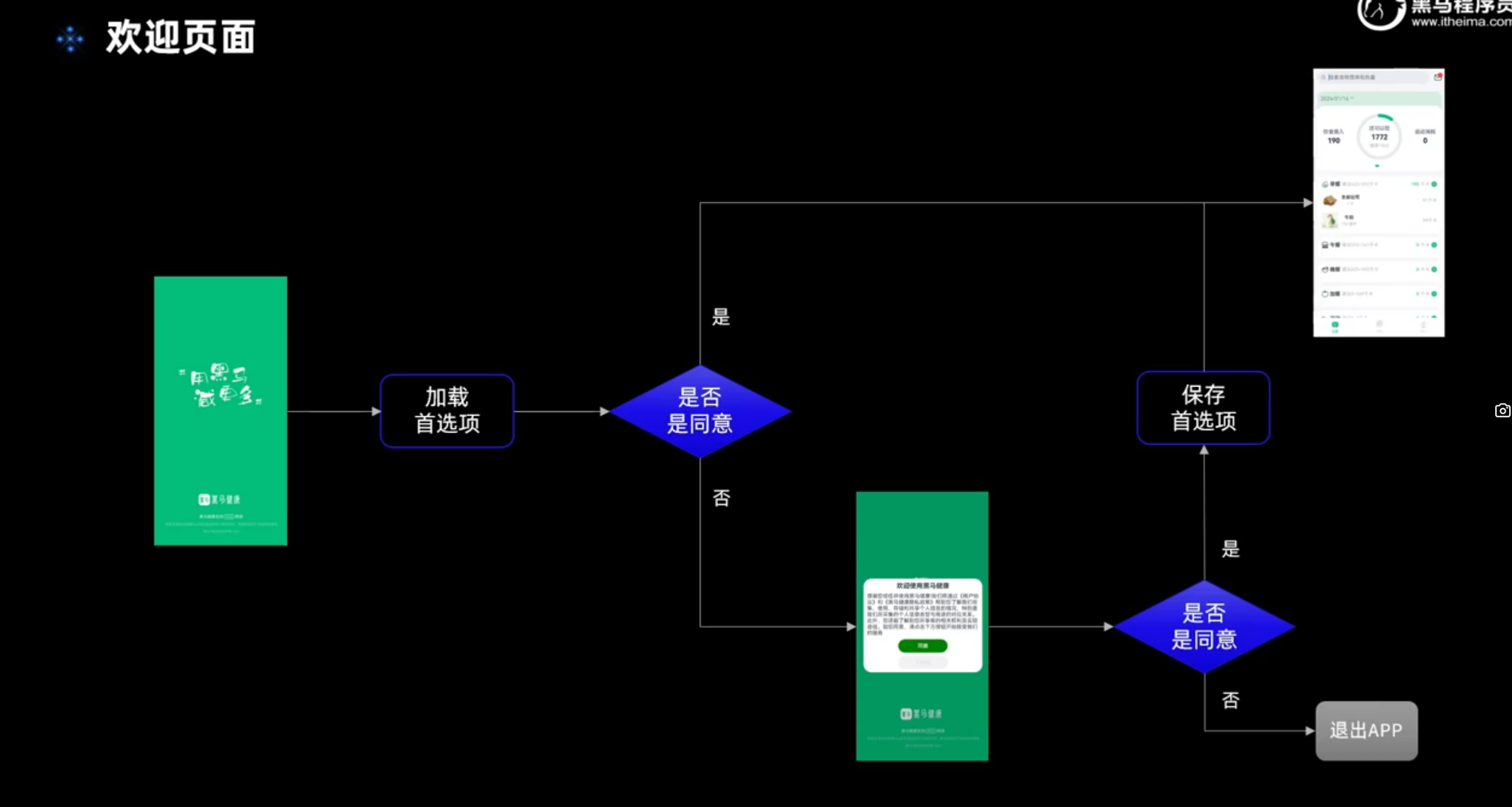 该代码通过组件WelcomePage(黑马健康欢迎页面) 来实现功能,在该页面中对用户的访问权限进行管理流程设计如下:首先会对用户的隐私政策 consenting状态进行检查;如果确认同意,则直接跳转至主页;否则将展示隐私政策对话框供用户进一步授权确认;在这一过程中可选择接受或放弃继续访问黑马健康的其他资源;当有用户点击‘接受’按钮触发时,默认会调用accept()函数来完成相应操作;而若发现有用户体验度不足的情况发生,则会自动触发reject()函数以终止当前操作流程。