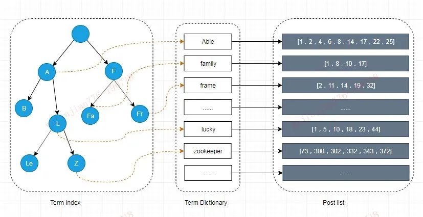 这棵树不会包含所有的 Term,它包含的是 Term 的一些前缀。通过 Term Index 可以快速地定位到 Term Dictionary 的某个 Offset,然后从这个位置再往后顺序查找。