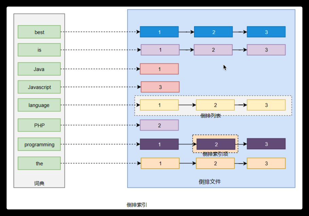 我们将上面的内容转换为图的形式来说明倒排索引的结构信息,如下图所示: