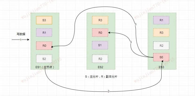 - ES1 节点将请求转发到 S0 主分片所在的节点 ES3,ES3 接受请求并写入到磁盘。