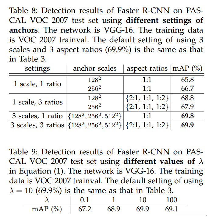 作者在后文中提到如果采用COCO数据集时,则会因为QQ数据集中这类小目标数量较多而采取相应措施,在此情况下额外增加了64平方这一尺寸来专门解决此类问题。这些 anchor 大小设置的原则性也很强,在不同场景中通常会根据不同类型的数据集合相应的 anchor 进行设计配置;当 anchor 尺寸与检测目标尺寸越匹配时,在实际应用中所获得的效果也会越好。值得注意的是,在这篇论文中一共采用了9个不同的 anchor 大小进行配置,并且这种设计特点使其具备了较强的适应性与平移不变性特征;因此在后续讨论过程中将主要围绕基于锚框的设计展开分析