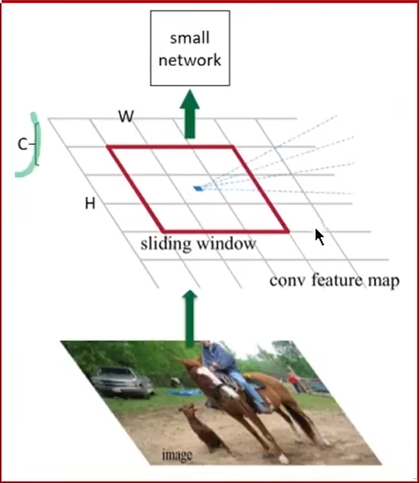 假设有H × W尺寸的一个特征图,并且该特征图包含c个通道。在此情境中仅展示了其中一个通道的情况:如果C设为256,则理论上剩余还有255个通道(即同样尺寸)的特征图存在。假设我们设定的空间窗口尺寸为3 × 3,则需要将这一区域内的所有(H × W) × 256通道(即局部)特征传递给后续的小网络使其能够基于这些局部特征求取原始图像相应局部是否存在候选框的可能性。确定完当前位置后将此窗口向右移动一小格并再次检查该(H × W) × 256维度空间中的局部是否能生成候选框如此不断移动至图像右下角边缘处则可获得整个图像上所有位置对应的候选框信息