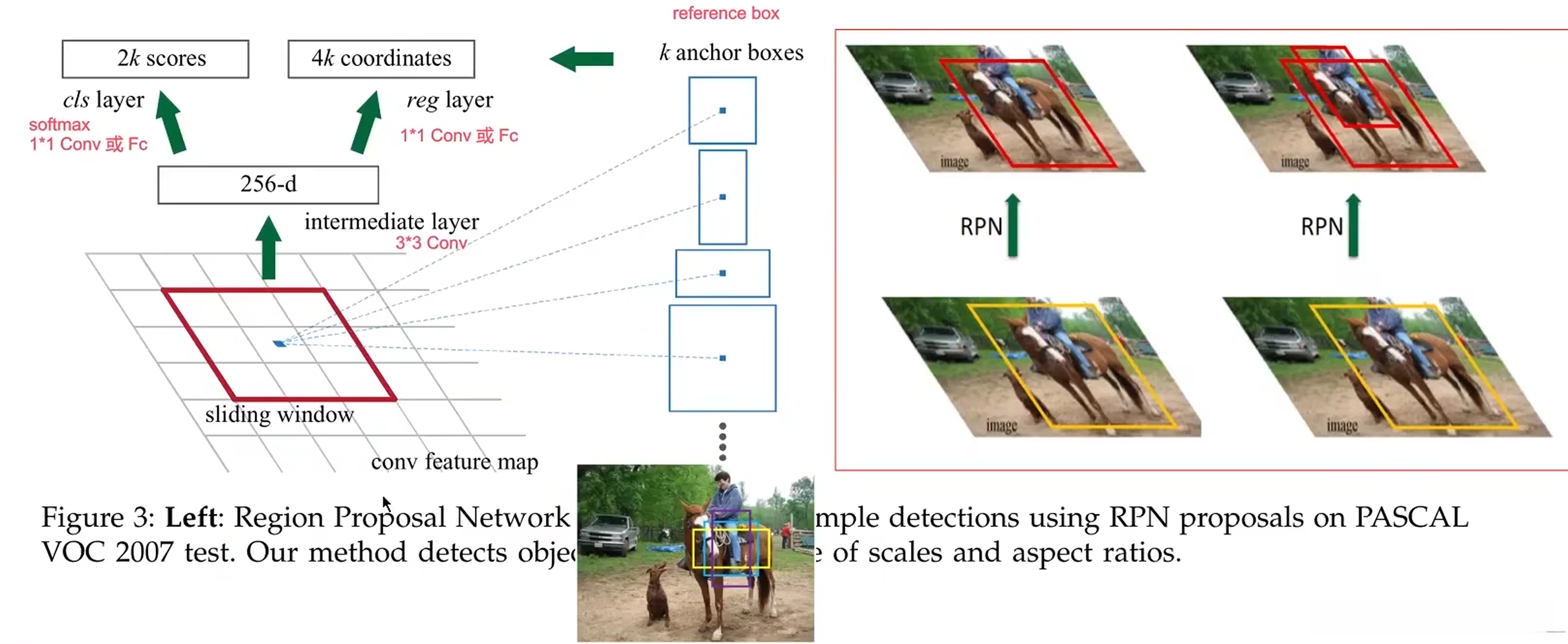 在这个地方(4)相对容易理解。这是因为整个RPN网络的主要目标是根据特定区域的特征,在原始图像中相应位置附近生成候选矩形框的中心点以及宽度和高度参数(共4个参数),这些信息足以唯一确定一个矩形框的位置。因此,在此位置上就是4的数量值。在这个理想状态下(红色框所示),马的位置应该是精确匹配的目标点;然而,在实际应用中(RPN模型),输出结果并不总是如此精确可靠;因此必须依靠另一个分支预测的结果(即2)来评估每个候选框是否包含目标物体。输出应为每个候选框对应的目标存在与否的概率值分布情况。那么问题来了:为什么这些输出结果后面都跟了一个K呢?这是因为目标检测领域中的一个重要概念——锚框(Anchor)。所谓锚框其实就是参考基准框,在利用特定区域特征生成候选框时,并不是凭空产生这些随机基准框(因为这样的随机基准效果通常不够好)。所以为了提高检测精度,在生成候选框之前就需要预先定义一组高质量的基础参考基准框(共有K个),然后通过计算每个基准框架偏移量的方式来得到最终的目标定位结果