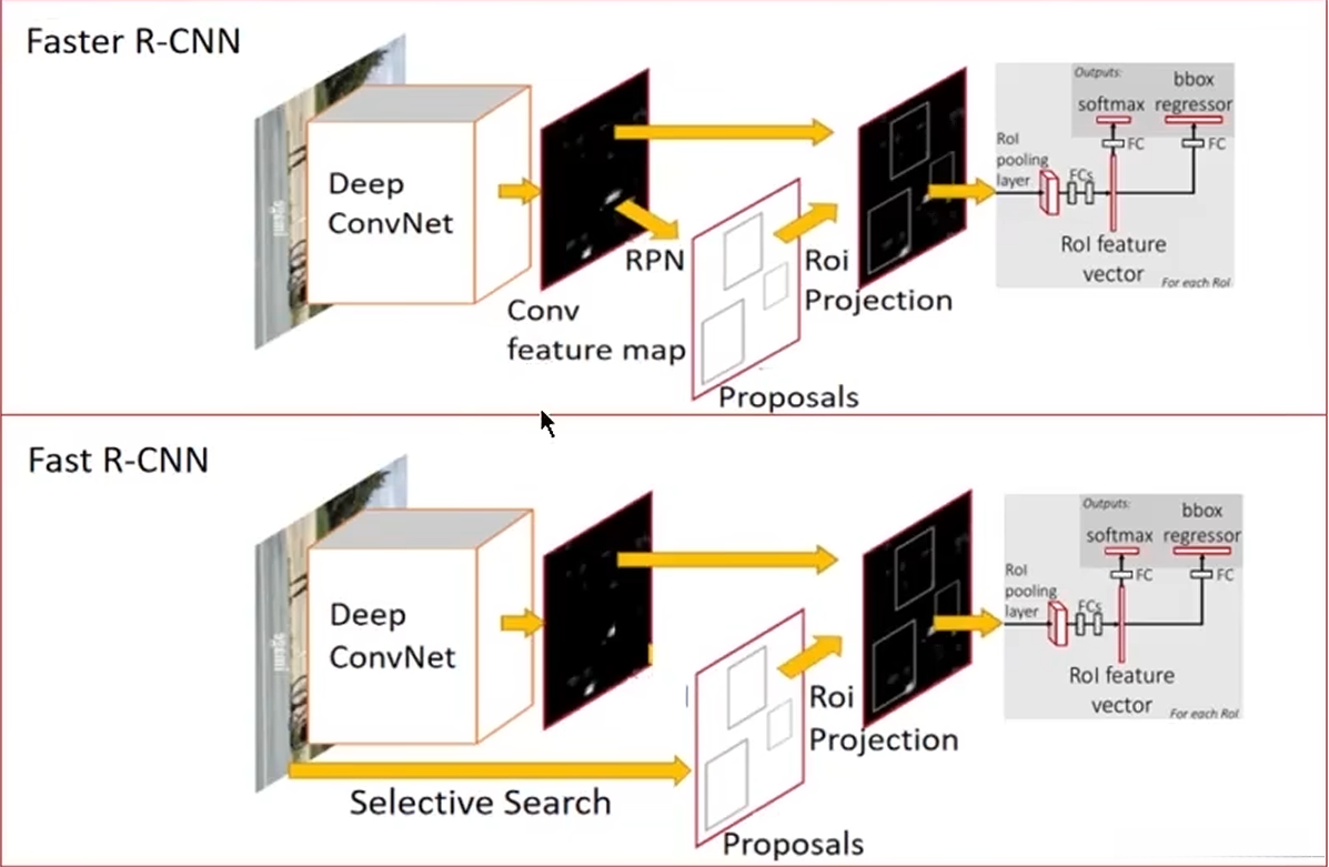 输入一张图像会通过深度卷积网络计算得到其卷积特征图,并将此特征图传递给RPN模块以生成候选区域的位置;接着通过对原始特征图进行ROI投影处理以获得RoI区域的特征,并基于这些候选区域的特征进行分类与回归处理。同样地,在Fast R-CNN架构中也会执行类似的步骤;不过两者的主要区别在于,在Fast R-CNN中是利用原图上的一个耗时的selective search算法独立地产生候选区域位置;而Faster R-CNN则是在共享的卷积特征空间中直接运用RPN模块来生成候选区域位置;因此,在Faster R-CNN算法中,关键创新点在于用RPN模块取代了传统的SS算法