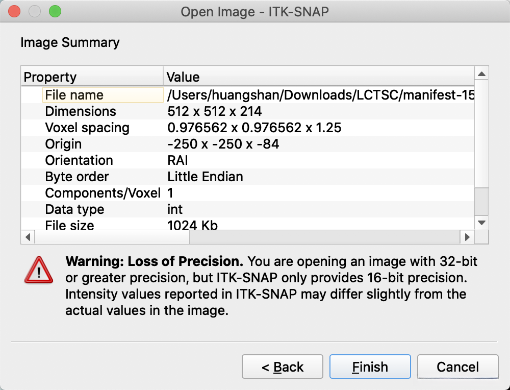 关于下载的数据文件,在使用ITK-SNAP进行查看时可能会出现警告信息:由于该数据文件具有32位深度的特点,并且该软件仅支持16位图像格式作为默认处理方式,在尝试加载此类高精度数据时可能会导致格式不兼容的问题出现