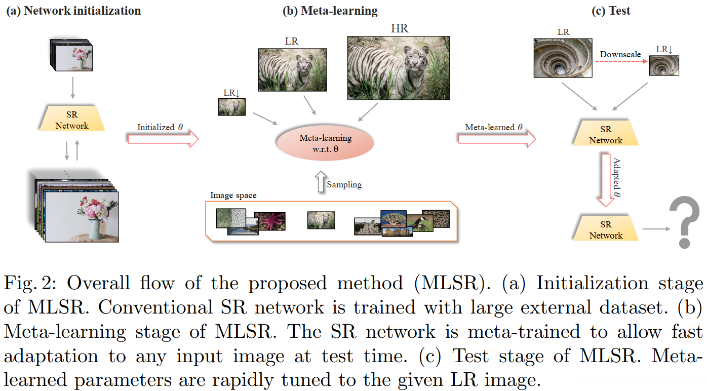 基于传统超分辨率的方法通常会在大规模的数据集上进行训练。然而该方法无法深入分析测试图像的内部细节。自监督学习的方法(实际上等同于零样本学习)通常需要较长的时间投入。而我们的方法则采用了元学习策略,在这一过程中能够有效提升模型性能,在实际应用中实现了对目标任务的高度适应性。