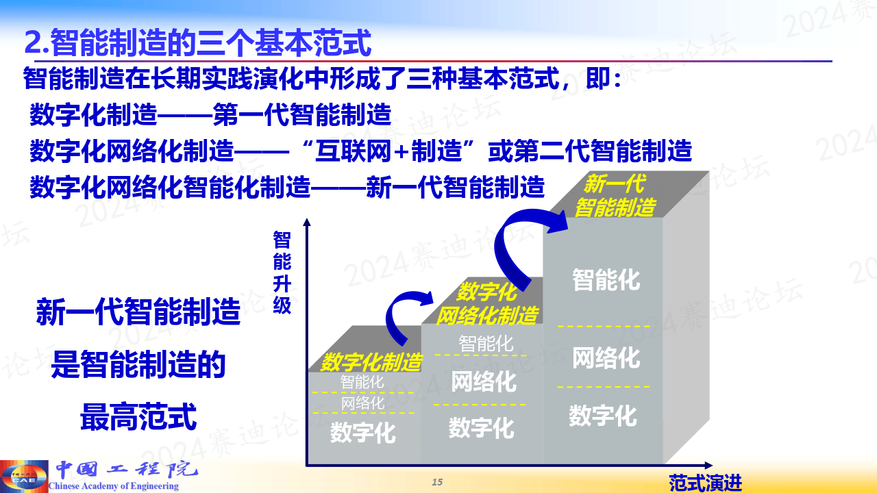 可以说智能制造是一个广泛的概念,并涵盖了从数字化制造到智能化升级的多个层次与技术路径。其中包含数字化网络化制造、数字化制造以及新一代智能化制造业等三种基本范式。其中最高级别的就是新一代智能化制造业。