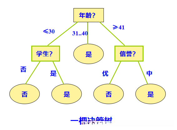 一棵决策树由一个根节点,一组内部节点和一组叶节点组成。每个内部节点(包括根节点)表示在一个属性上的测试,每个分枝表示一个测试输出,每个叶节点表示一个类,有时不同的叶节点可以表示相同的类。