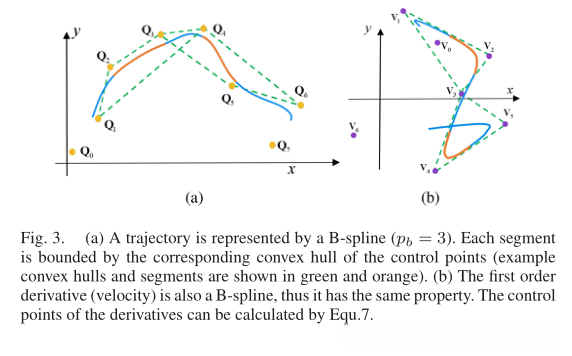 通过凸包特性(图3),为了加强由非均匀B样条表示的轨迹的动态可行性,在可行域内加强一阶导数和二阶导数的所有控制点就足够了。我们证明,这可以通过改变第V-B节中不可行控制点的相应结跨度来实现。