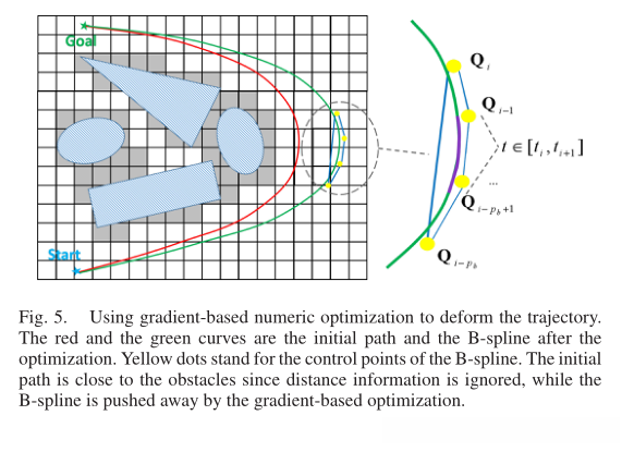 如第III-D。由路径搜索产生的路径可能是次优的。此外,由于忽略了自由空间中的距离信息,该路径通常接近障碍物(图5)。因此,我们在所提出的B样条优化中提高了路径的平滑度和间隙。利用均匀B样条的凸包特性,结合欧几里德距离场和动态约束的梯度信息,在很短的时间内收敛,生成平滑、安全和动态可行的轨迹。