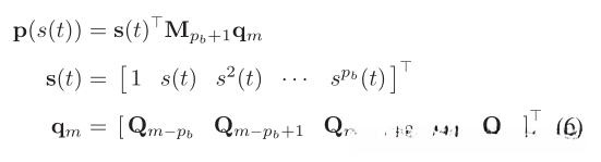 B样条是一个分段多项式,由其阶数pb、N+1个控制点{Q0,Q1,…,QN}和节点向量[t0,t1,…,tM]唯一确定,其中Qi∈ R3,tm∈ R和M=N+pb+1。B样条轨迹由时间t参数化,其中t∈ [tpb,tM−pb]。对于均匀B样条曲线,每个节点跨度Δtm=tm+1− tm具有相同的Δt值。评估时间T的位置∈ [tm,tm+1)⊂ [tpb,tM−pb],我们首先将t归一化为s(t)=(t− tm)/Δt。然后,可以使用矩阵表示[17]来评估位置: