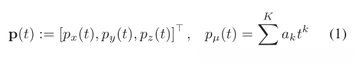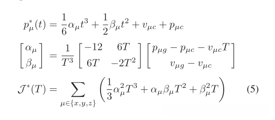 我们首先讨论Expand()中使用的运动原语的生成。四旋翼系统的差分平坦度允许我们通过三个独立的一维时间参数化多项式函数来表示轨迹[1]: