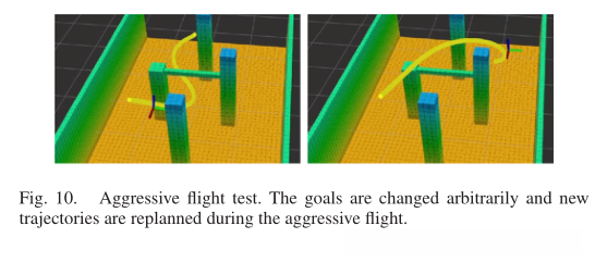 攻击性飞行实验在图10所示的环境中进行。在实验中,四旋翼的目标被人类不断地任意改变。一旦设定了新的目标,就会立即重新规划并执行新的轨迹。最大速度和加速度分别设置为2.5 m/s和1.5 m/s2。这项任务在几个方面具有挑战性。由于飞行是积极的,目标的变化是突然的,运动规划模块应在相当短的时间内生成新的轨迹,以快速对变化作出反应,从而使四旋翼的运动是连续的和平滑的。此外,由于环境受限且杂乱,很难在很短的时间内生成平滑、安全且动态可行的轨迹。该实验验证了我们的方法在可行性的前提下可以生成攻击性运动。它还表明,即使在攻击性飞行过程中目标突然改变,我们的方法也可以在复杂环境中快速生成新的轨迹。视频中还包括更多细节。
