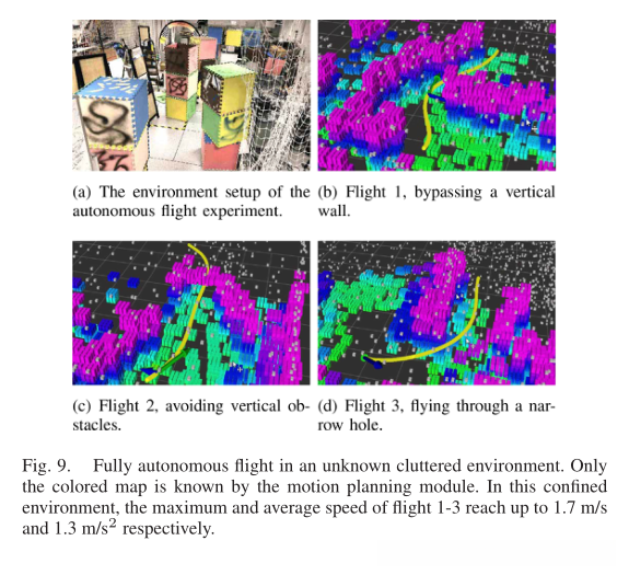 我们在具有挑战性的未知环境中进行了完全自主的快速飞行实验(图9(a))。为了进一步挑战我们的方法,我们使用以四旋翼为中心的半径为5m的球体修剪全局地图,并仅使用该球体内的地图生成轨迹(图9(b)–9(d)),这比我们的真实感知范围小得多。非结构化环境、有限的感知范围以及高飞行速度对运动规划模块构成了挑战,因为它应该在突然出现新威胁时持续快速地重新生成轨迹。我们请读者参阅视频附件以了解更多详细信息。