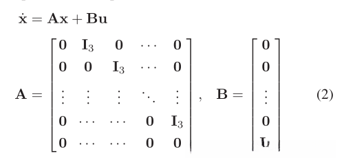 其中μ∈ {x,y,z}。从四旋翼系统的角度来看,它对应于线性时不变(LTI)系统。设x(t):=[p(t)?,˙p(t),…,p(n−1) (t)?]?∈ 十、⊂ R3n是状态向量。设u(t):=p(n)(t)∈ U:=[−umax,umax]3⊂ R3是控制输入。状态空间模型可以定义为: