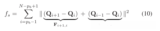 从物理角度来看,该公式将轨迹视为弹性带,其中每个项Fi+1,i=Qi+1− Qi和Fi−1,i=Qi−1.− Qi是连接节点Qi+1、Qi和Qi的两个弹簧的合力−1、Qi。如果所有项都等于零,所有控制点将均匀分布在一条直线上,这是理想的平滑。