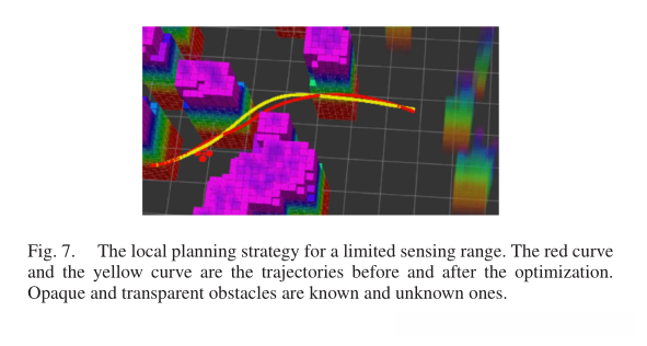 1) 最近的地平线局部规划:当四旋翼机在未知环境中飞行时,由于感应范围有限,它必须频繁地重新规划其轨迹。为了提高效率,我们采用了后退地平线规划方案,其中轨迹仅在已知空间内生成(图7)。一旦运动基元在该范围之外结束,路径搜索就终止,然后进行优化和时间调整。在未知空间进行规划通常是无用的,因此可以节省这些努力。