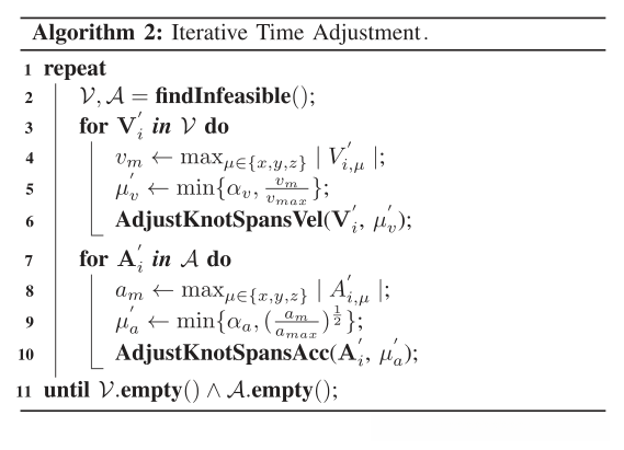 根据第V-B算法。2来增强动态可行性。它迭代地找到轨迹的不可行速度和加速度控制点V和A(第2行),并调整相应的结跨度(第3-10行)。因为结跨度Δtm影响几个控制点,反之亦然,所以边界μ?v和μ?αv和αa两个常数略大于1(第5行,第9行),可防止任何时间跨度过度延长。