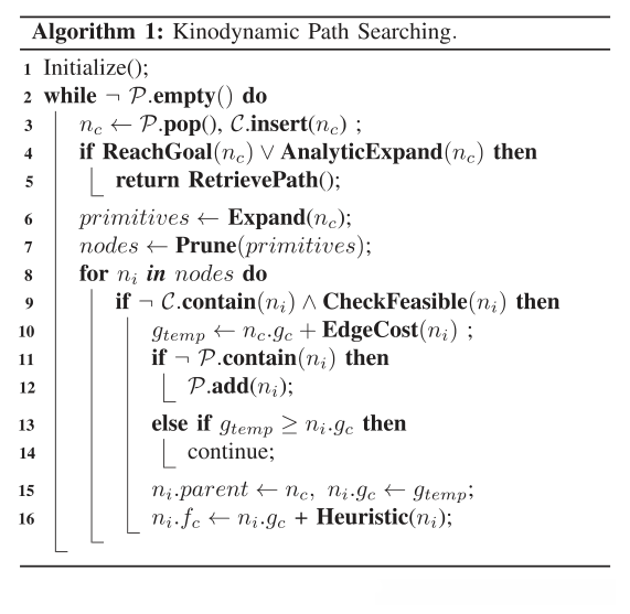 我们的前端运动动力学路径搜索模块源自首次为自动驾驶汽车提出的混合状态A搜索[15]。它在体素网格图中搜索安全且动态可行的轨迹,该轨迹在持续时间和控制成本方面是最小的。如算法1和图2所示,搜索循环类似于标准A算法,其中P和C表示开集和闭集。与直线不同,与四旋翼动力学相关的运动图元被用作图形边缘。结构节点用于记录基元、基元结束的体素以及gc和fc成本(第III-B节)。基本体迭代地展开()体素栅格贴图,并修剪除具有最小fc的体素之外的同一体素中的那些(删减())。然后CheckFeasible()检查剩余原语的安全性和动态可行性。这个过程一直持续到任何原始的达成目标或AnalyticExpand()(第III-C节)成功为止。