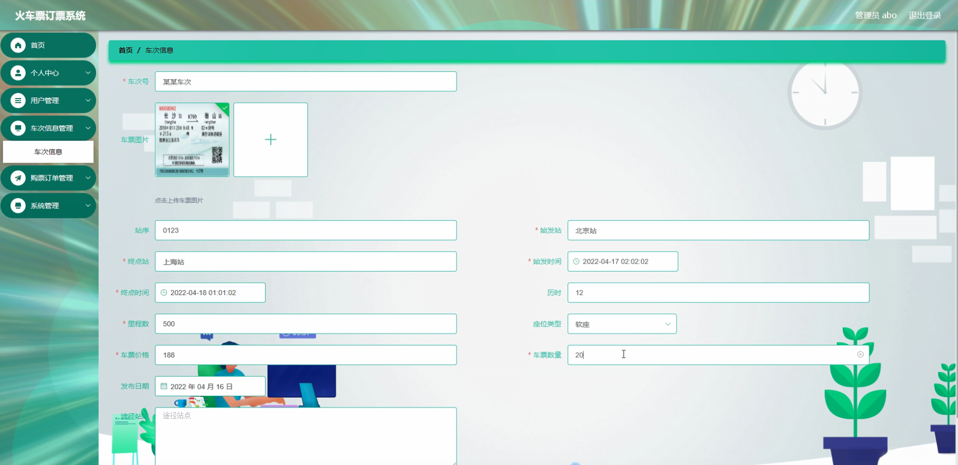 - 车次信息系统功能:在此功能中,用户可以查询到所有可用的列车车次、发车时间、到达时间、座位类型等信息。此外,系统还应支持根据用户需求推荐合适的车次。