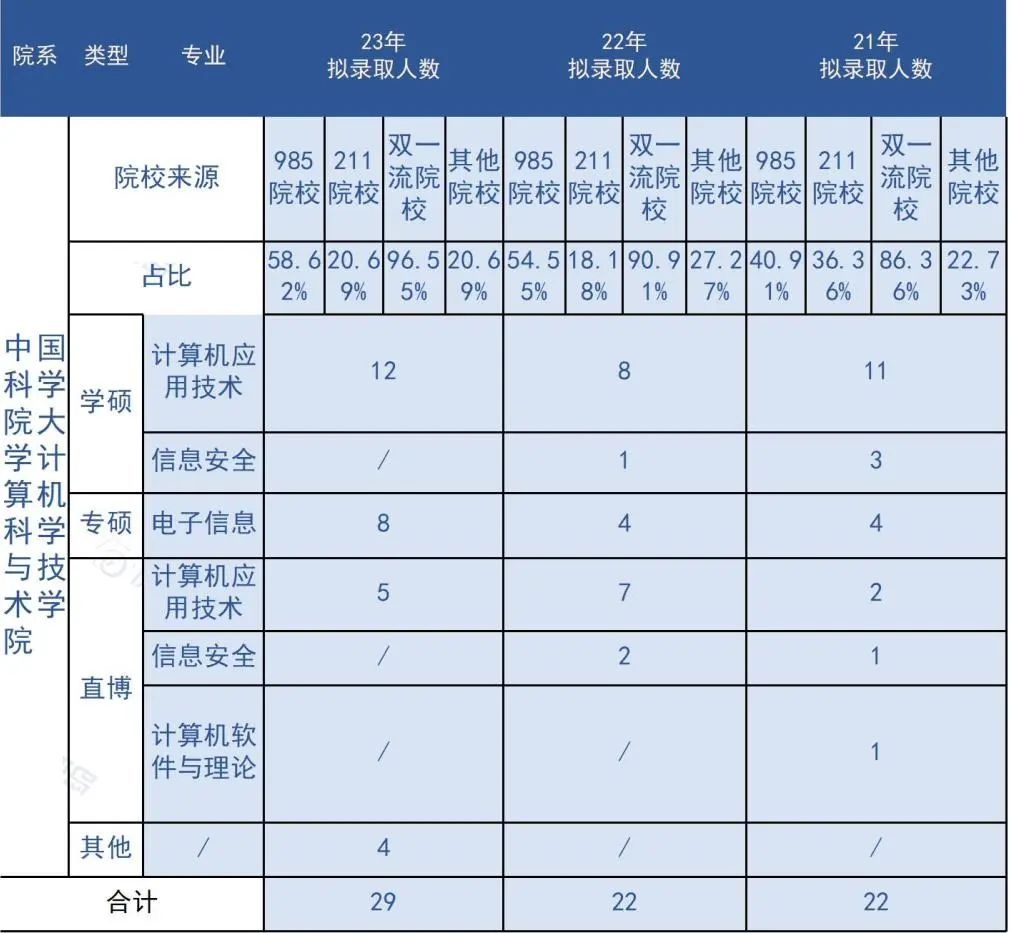 整体而言,在中国科学院大学计算机科学与技术学院近年来的招生规模中985院校学生比例相对较低 ,达到约50%-60%的比例;其中拥有"双一流"项目的学校占90%以上;仍有相当比例来自二本及以下院校的学生。近年来的数据表明对该学院的专业学术背景要求较为宽松 ,尤其是对于二本及以下院校的同学而言;对于这类学生群体而言,尝试申请该学院可能是有益的