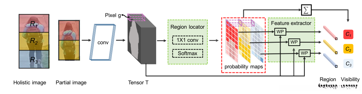VPM采用全卷积设计,VPM输入行人图像,输出区域特征和一系列区域可见性得分。
