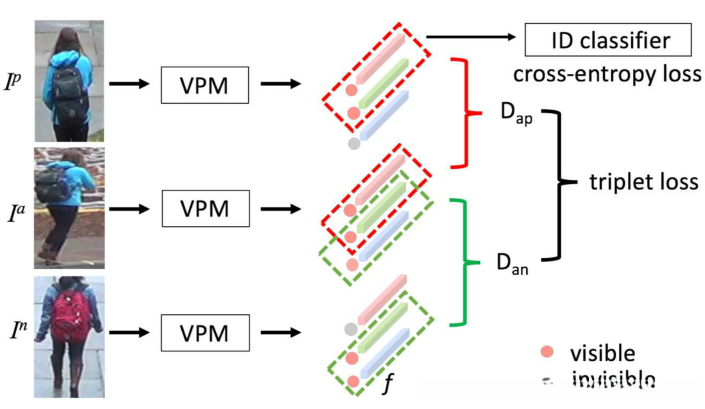 2.用了什么解决方法:提出VPM网络,以自监督训练为主要方法,使得网络自发的更关注共存的区域,对于不可见区域在计算距离时产生作用小,可见区域起的作用大。同时自监督训练使用交叉熵损失训练网络进行区域分类,使用三元损失寻来你网络进行身份分类。最终消除局部区域错位匹配现象。