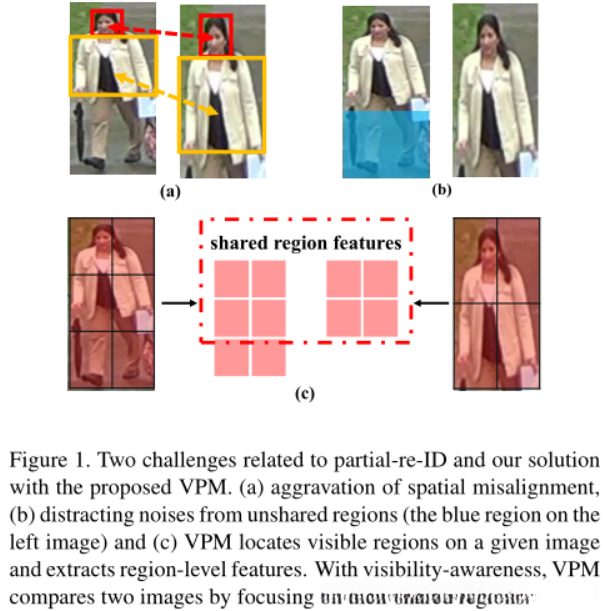 这篇文章考虑了行人再识别的局部区域Reid的问题,在partial re-ID情况下,图像也许只包含行人的部分外观。如果直接将部分行人图像与整体图像比较,那么空间错位会损害所学到的识别能力。于是,提出了一个Visibility-aware Part Model (VPM),该模型可以通过监督学习来感知区域可见性,也就是说可以发现哪些人的图像是不完整的。VPM模型关注的是局部特征,当比较两个图片时,VPM会只关注他们都共同存在的区域,就不去比较被遮挡的部分了。VPM对Reid任务有两方面好处,(1)VPM学习局部细粒度特征。(2)VPM关注两张比较图片都存在的区域,抑制比较错位。