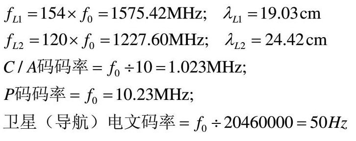 以c表示光在真空中的速度,其数值大约是3×10⁸ m/s.基于这一关系式可以计算得出载波L₁的波长λ₁大约为19厘米,而L₂的波长λ₂约为24.4厘米,则与上述基准频率计算结果相符合.