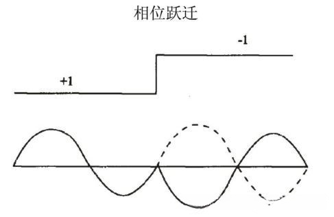 通过将码状态与载波信号进行乘法运算即可完成调制过程。在码状态为加一时进行运算后不会影响到载波的相位;而当码状态为减一时进行运算后,则会使得载波的相位发生翻转。由此可知,在编码信息变化的过程中(即从一个比特转换到另一个比特),例如从低电平转换到高电平或相反的情况下,“跳变”或者“跳变现象”会发生。