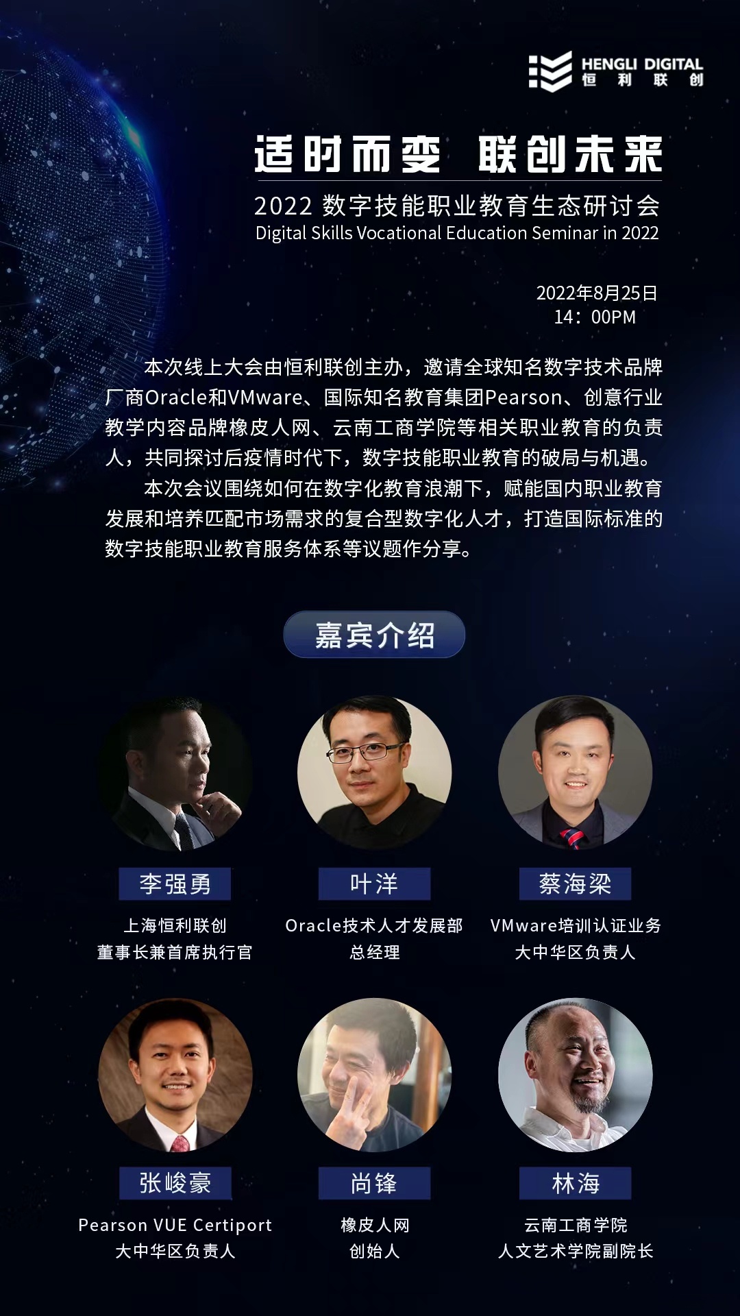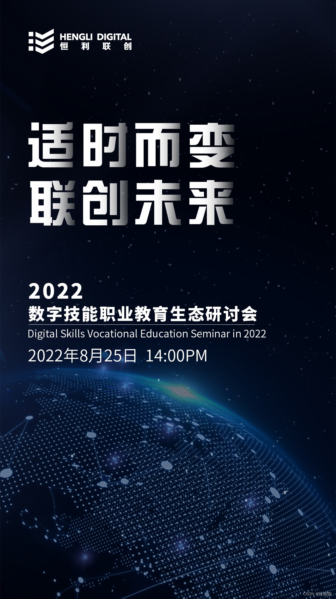 为了解读后疫情时代的机遇与挑战,“适时而变”的理念引领着我们共同探索未来。恒利联创定于2022年8月25日下午两点整,在线举办“适时而变:联创未来”的数字技能职业教育生态研讨会。