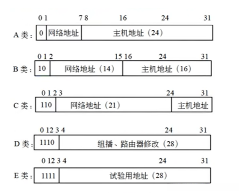 (5)E类地址识别头为11111为实验保留,网络号240-255。