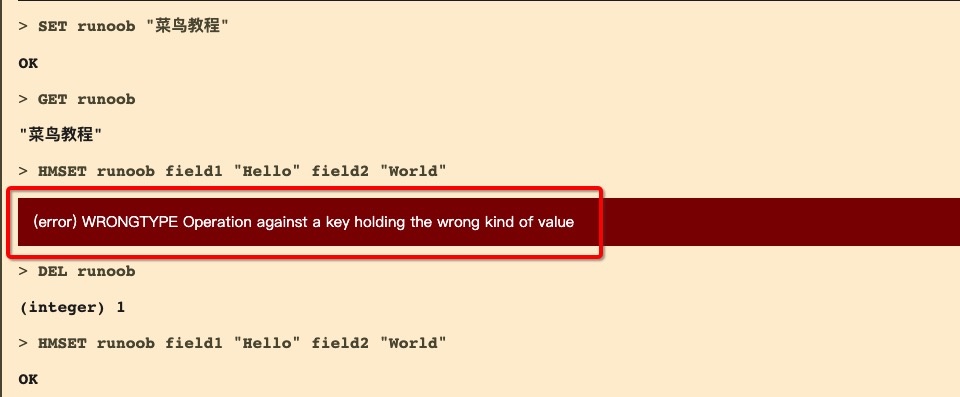 del runoob 用于删除之前已测试过的键;如果不这样做,则会报错:(error) WRONGTYPE Operation against a key holding the wrong kind of value