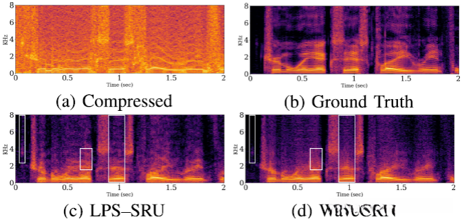 图3所示。LPS SRU和WaveCRN生成的原始、压缩和恢复语音的幅度谱图。(一)压缩。(b)Ground Truth。(c) LPS-SRU。(d) WaveCRN。