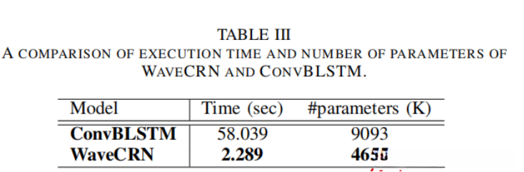 最后,我们比较 WaveCRN 和 ConvBLSTM 在推断时间和模型复杂性方面。表III 中的第一列显示了正向传递的执行时间,第二列显示了参数的数量。在相同的超参数设置(层数、隐含状态维数、通道数等)下,与ConvBLSTM相比WaveCRN的执行速度提高了 25.36 倍,参数数目仅为 ConvBLSTM 的 51% 。