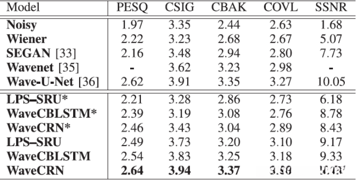 (1)语音去噪:与Wiener滤波、SEGAN、使用相同L1损耗的两个知名SE模型(即WaveNET和Wave-U-Net)、使用LPS特征作为输入的LPS-SRU以及结合CNN和BLSTM的Wave CBLSTM进行了比较。WaveCBLSTM是通过用LSTM代替图1中的SRU来实现的,可以看到WaveCRN在所有感知和信号级评估指标方面都优于其他模型。