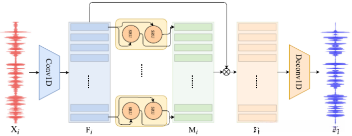 如图1所示,我们的模型利用了CNN和SRU的优势。给定第i个带噪语音Xi,在一个batch中,一维卷积首先将Xi映射到特征映射Fi中进行局部特征提取。然后Bi-SRU计算一个RFM Mi,该Mi元素巧妙地将Fi相乘生成一个掩蔽特征映射F′。最后,转置的1D卷积层从掩蔽特征F′i恢复增强的语音波形Xi。