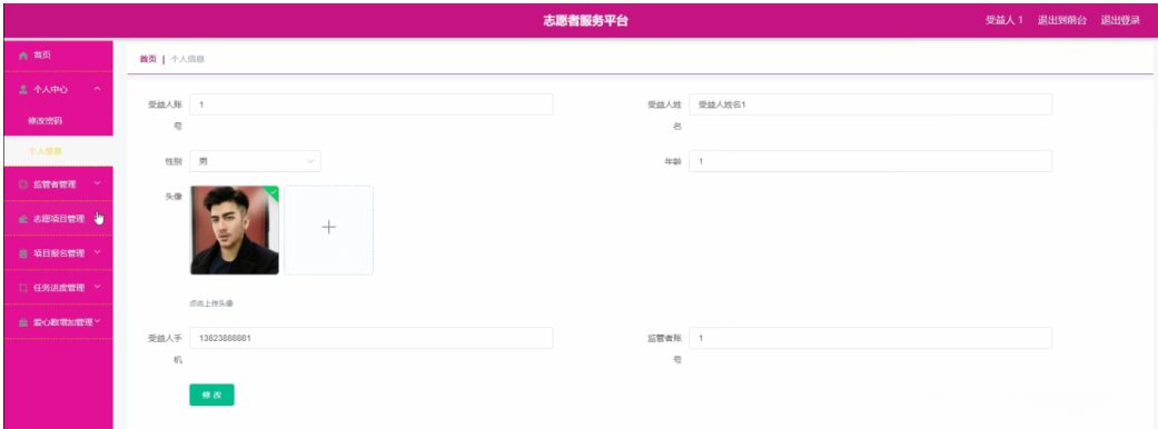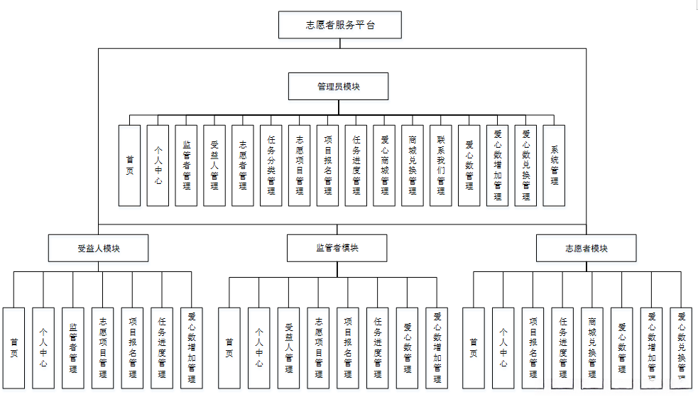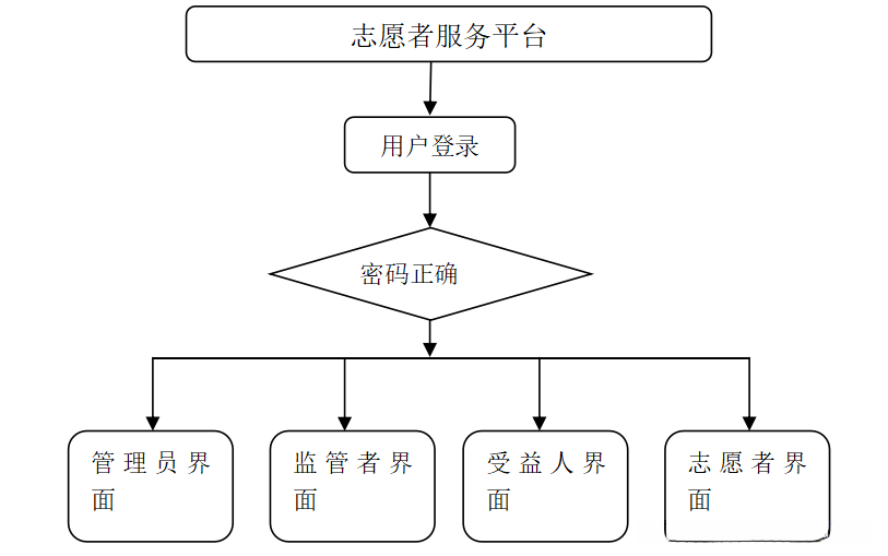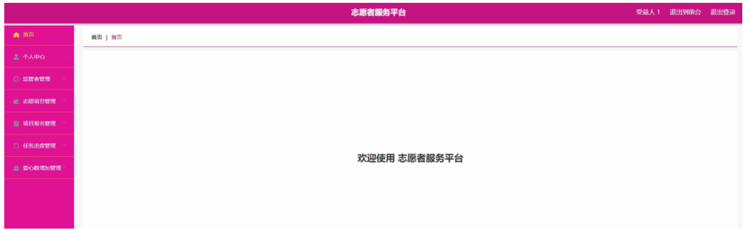 参与者通过登录志愿者服务平台可在此平台完成包括首页、个人中心、监管者管理等具体内容的操作流程。